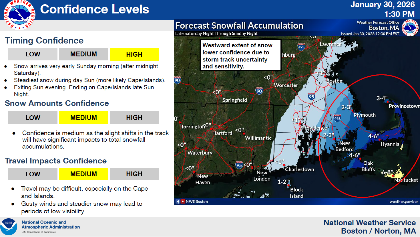 Snow is expected to arrive early Sunday morning (after midnight Saturday) through Sunday night. The steadiest snow will occur during the day. Snow amounts are still uncertain; current modeling shows a medium confidence level of 4-6 inches for the Mid-Cape and 3-4 inches for the Outer Cape. Travel may be difficult. Gusty winds and steadier snow will lead to periods of low visibility.