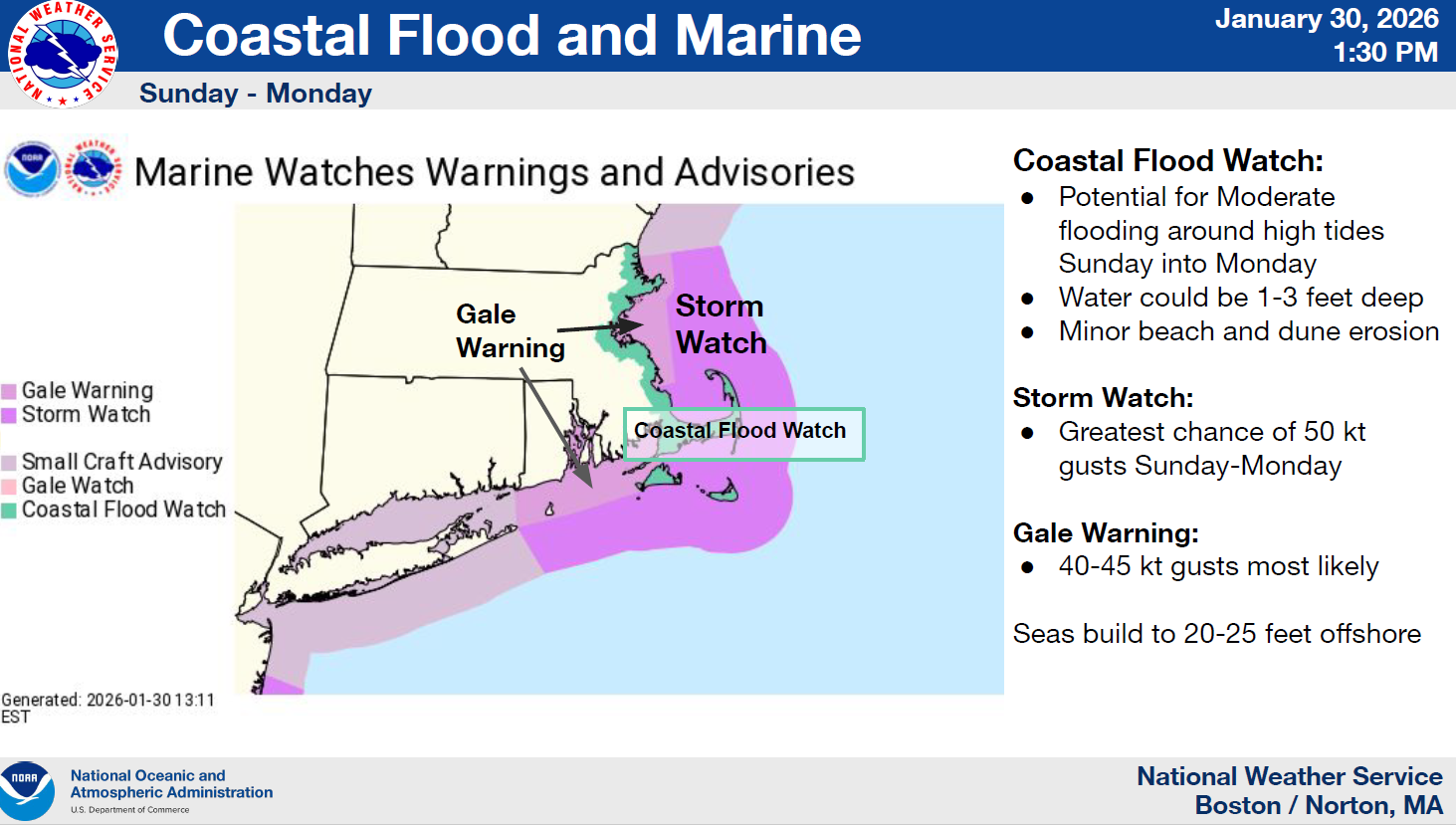 Additionally, there is a Coastal Flood Watch in effect Sunday into Monday, as there may be moderate flooding around high tides, as well as a Storm Watch and Gale Warning.